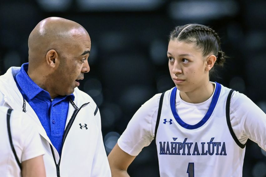 Mahpiya Luta head coach Matt Rama talks to Ashlan Carlow-Blount during a timeout during their game against Wall in the LNI semifinal game on Friday at The Monument. (Matt Gade/605 Sports)