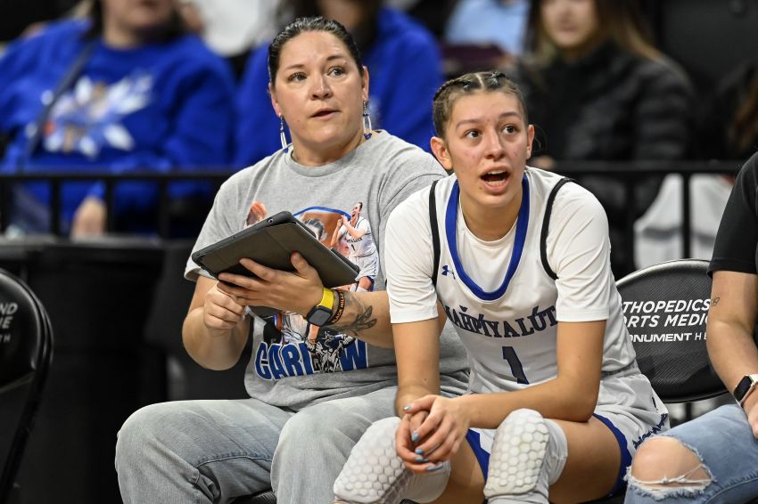 Mahpiya Luta's Ashlan Carlow-Blount sits next to assistant coach and her mom Amanda Carlow during their game against Wall in the LNI semifinal game on Friday at The Monument. (Matt Gade/605 Sports)