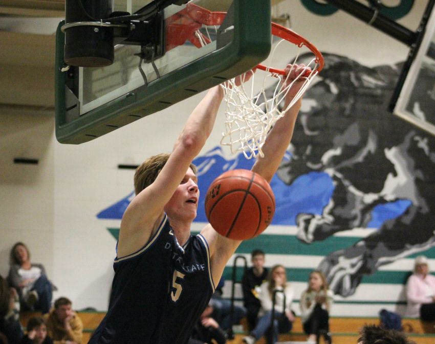 Pierre's Jackson Edman goes up for a dunk at the 3-Class Shoot-Out on Saturday in Salem. (Ryan Deal / 605 Sports)