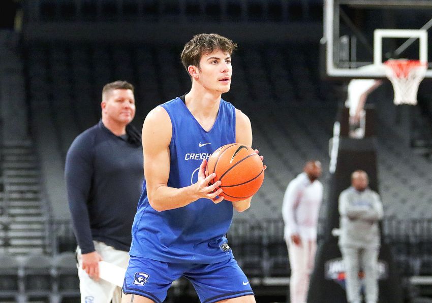Creighton assistant coach looks on as his nephew Mason Miller takes a shot during a shoot around before the Bluejays' game against BYU on Dec. 10, 2022 at the Jack Jones Hoopfest in Las Vegas. (Rodney Haas/605 Sports)