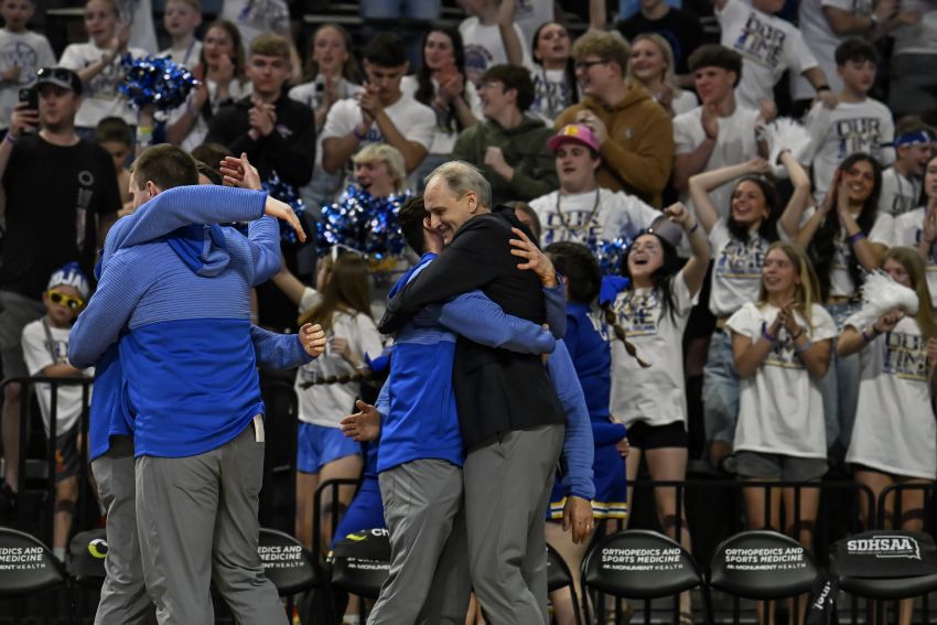 West Central head coach Dave Hollenbeck celebrate their victory over Sioux Falls Christian in the Class A championship in the boys state tournament on Saturday at Summit Arena at The Monument in Rapid City. (Matt Gade / 605 Sports)