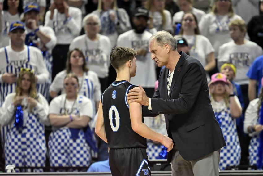West Central's Dave Hollenbeck talks with junior guard Connor Mebius during the Class A state championship on Saturday, March 21, 2026, in Rapid City. (Matt Gade / 605 Sports)