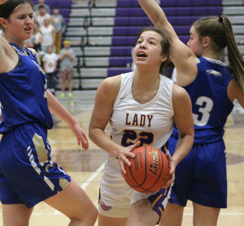 White River's Maleighya Estes attacks the basket against Wall on Saturday in Watertown. (Ryan Deal / 605 Sports)
