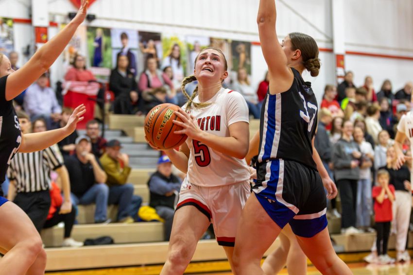 Arlington's Jaelyn Huntimer drives to the basket during the Cardinals' 56-40 win over Iroquois-Lake Preston on Dec. 15, 2025, in Arlington. (Jon Akre / 605 Sports)