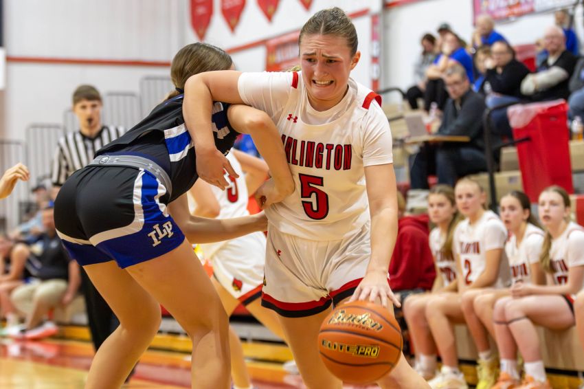 Arlington's Jaelyn Huntimer dribbles past a defender during the Cardinals' 56-40 win over Iroquois-Lake Preston on Dec. 15, 2025, in Arlington. (Jon Akre / 605 Sports)