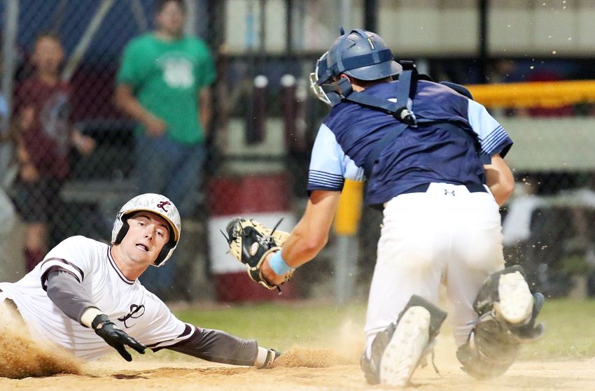 Lesterville’s Ethan Wishon slides safely past Tabor catcher Joey Slama tag during the ninth inning of the Broncs 12-7 win over the Bluebirds during the annual Czech Days amateur baseball game on Thursday in Tabor. (Rodney Haas / 605 Sports)
