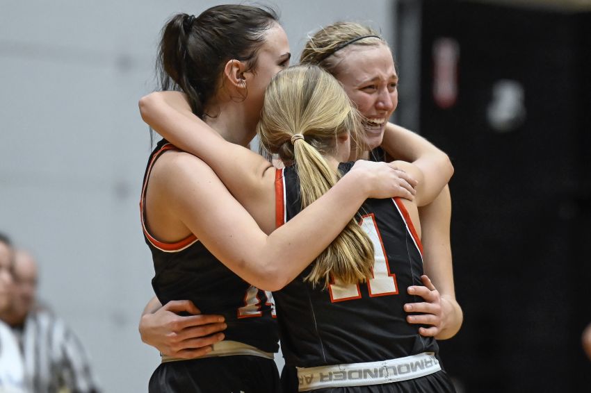 Viborg-Hurley's Molly Mason hugs Coral Mason while Charley Nelson hugs Estelle Lee (11) in the final minute of the Class B State Championship game on Saturday at the Huron Arena.
