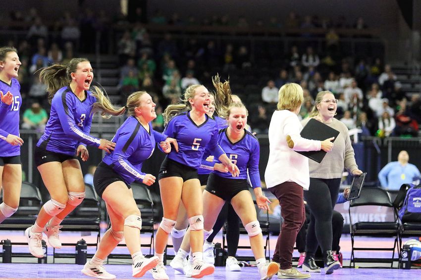 Elk Point-Jefferson celebrates upsetting No. 1 Wagner on Thursday at the Class A state volleyball tournament in Sioux Falls. (Rodney Haas / 605 Sports)