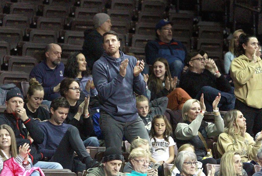 Mount Vernon native Chad Greenway cheers for Providence Academy on Thursday at the Hoop City Classic in Sioux Falls. (Rodney Haas / 605 Sports)