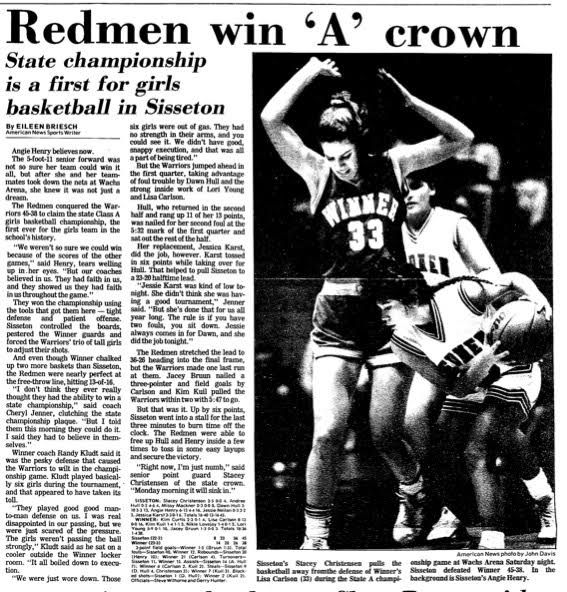 Jessie Leverson was part of a Sisseton team that qualified for the state tournament for the first time in 1990. Intimidated not at all the girls defeated Winner 45-38 to hoist the championship trophy for the first time in school history.