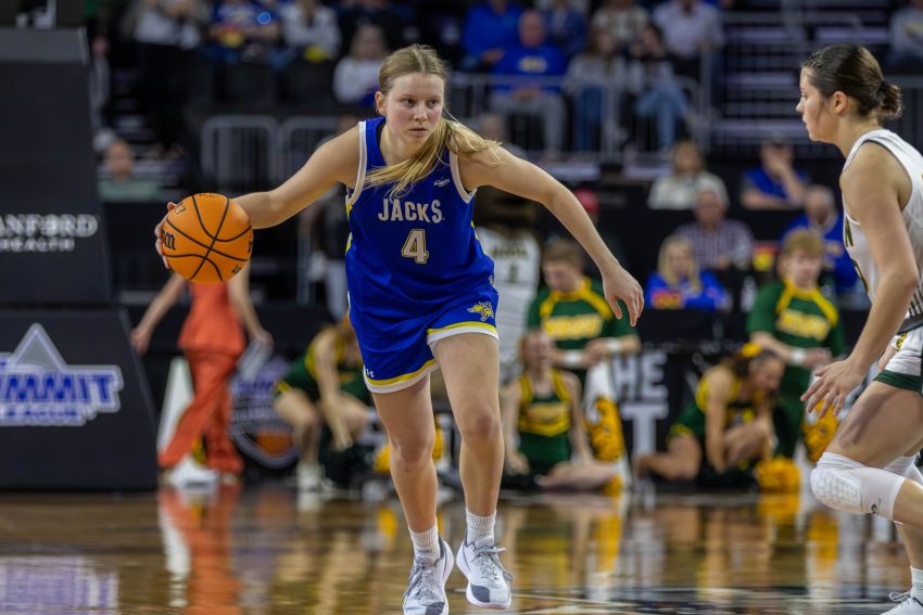 Emilee Fox dribbles up the floor during the Jackrabbits' 64-51 win over North Dakota State in the Summit League Championship on March 8, 2026, at the Denny Sanford PREMIER Center Sioux Falls.
