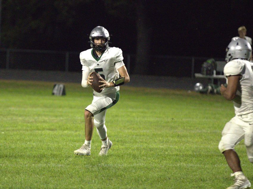 Clark/Willow Lake's Joey Ries looks to pass the ball during the Cyclones 26-8 win over Sioux Valley on Sept. 12, 2025, in Volga. (Jon Akre / 605 Sports)