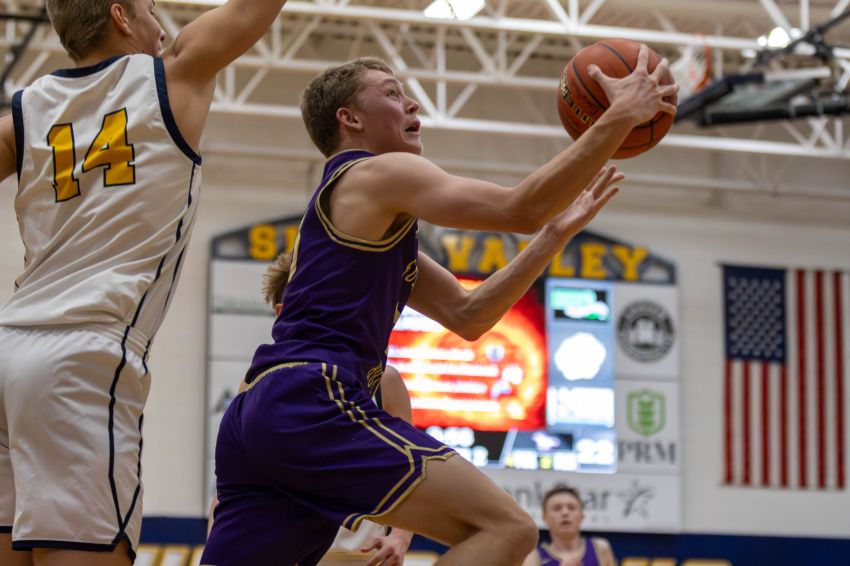 Sully Buttes' Wesley Wittler goes up for a layup during a boys basketball game against Sioux Valley on Jan. 10, 2026, in Volga. (Jon Akre / 605 Sports)