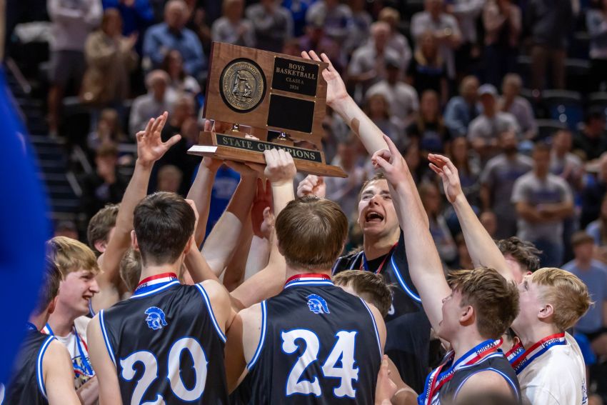 West Central hoists the Class A state championship trophy after beating Sioux Falls Christian, 66-56, in the state championship game on Saturday, March 21, 2026, in Rapid City. (Jon Akre / 605 Sports)